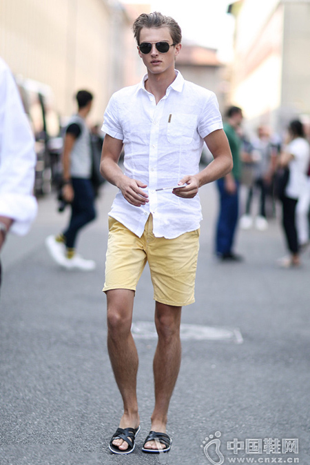 白色短袖衬衫搭配浅黄色短裤,脚踩黑色休闲拖鞋。