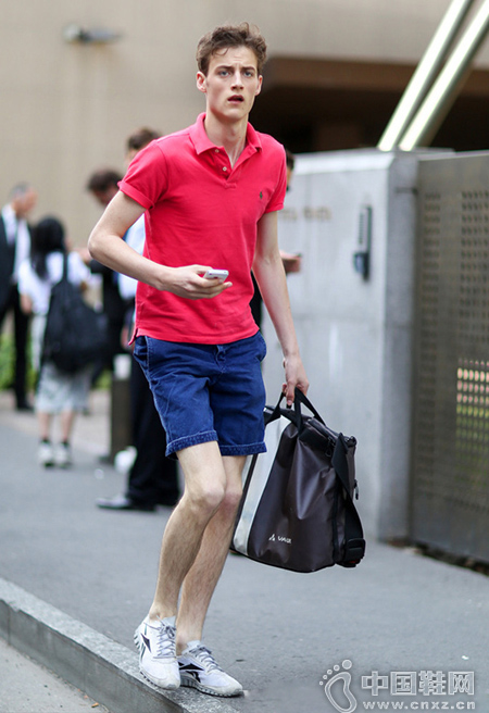 红色polo衫搭配深蓝牛仔短裤,脚踩白色跑鞋,手拎红色休闲皮包。(中国鞋网-最权威最专业的鞋业资讯中心。合作媒体:)
