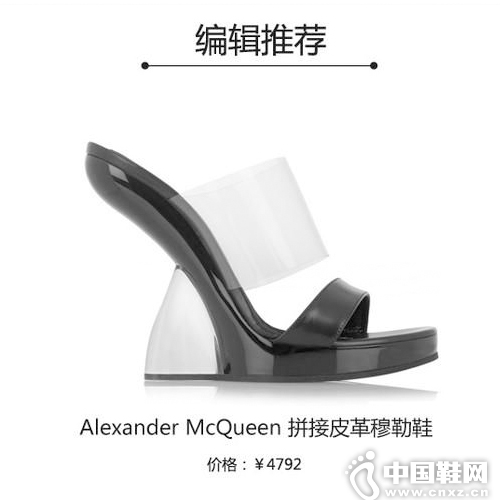Alexander McQueen 这款皮革与 PVC 穆勒鞋曾出现在该品牌 2015 春夏度假系列的所有造型中。其有机玻璃半坡跟置于足弓部位,而非传统的后跟位置,呈现出惹眼的颠覆性设计。建议搭配精裁上下装单品。
