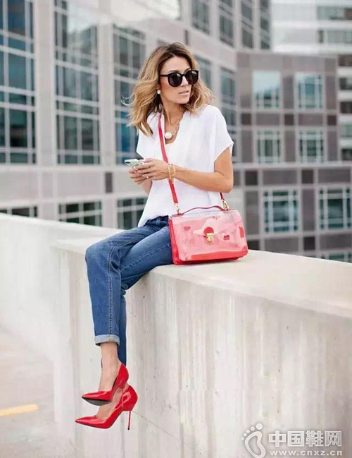 牛仔裤、白T相信是每妞的衣橱中最多的单品之一,不过今夏选择上一款红色高跟鞋搭配不仅养眼还增添上几分妩媚感,而红色PVC材质的单肩包正好和鞋子相得益彰。
