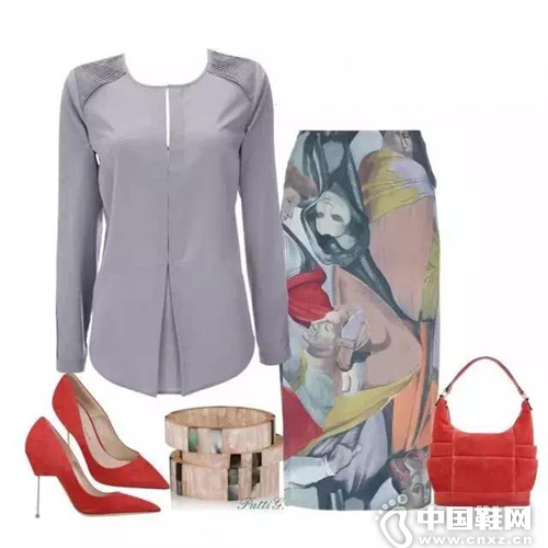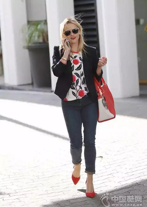 红色高跟鞋照样可以搭配印花衫和西装,削弱了红色的张扬,端庄优雅中仍带有强势的女人味。
