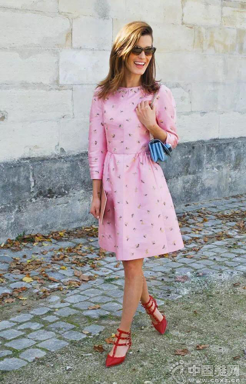今夏大玩印花粉嫩造型,而一双潮墨镜更添了些许现代感,粉色印花连衣裙与绑带红色高跟鞋搭配淡蓝色链条包,可以成为白领们效仿的着装榜样。