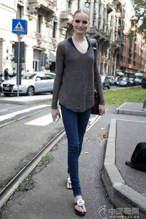 人字拖走起路来“踢踢跶跶”,所以总给人一种拖泥带水的感觉。平日出门如果想轻松休闲又不失干练,就用人字拖搭配修身长裤吧。没有超模们大长腿的我们,只要记得挽起一小段裤腿露出脚踝就能视觉上“长个儿”啦。