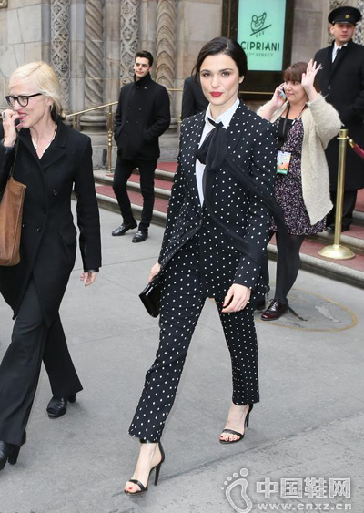 著名女星Rachel Weisz身着Givenchy早秋波点套装依然搭配黑色一字带凉鞋,这双鞋子真是可以很性感妩媚,也可以帅气干练。