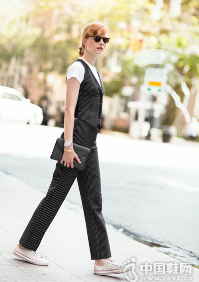 细条纹可以显人瘦长,配一切平底鞋都是OK的。此处博主为神马非要配一双帆布鞋呢?因为现在搭配运动鞋时髦呀!