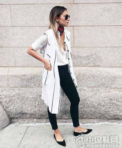 越是简单的鞋就越是讲究线条,这款尖头鞋的线条就很美!所以整身简单洗练一些,也是符合鞋的风格的。长外套很显高哦,而且无袖设计也不会很累赘。