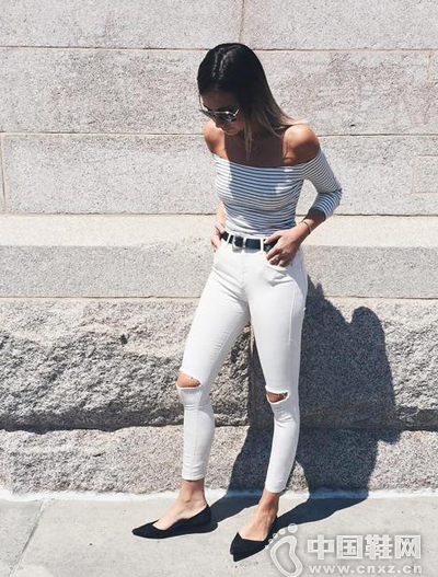 9.【条纹露肩T恤+白色窄脚裤+尖头鞋】