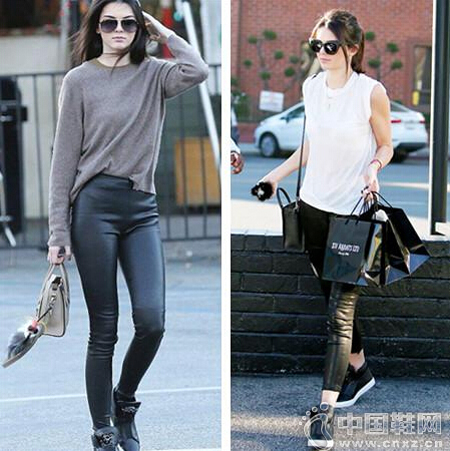 金小妹喜欢用最简单的造型搭配高帮运动鞋,皮裤,灰色或白色T-shirt,墨镜戴起来酷酷哒。