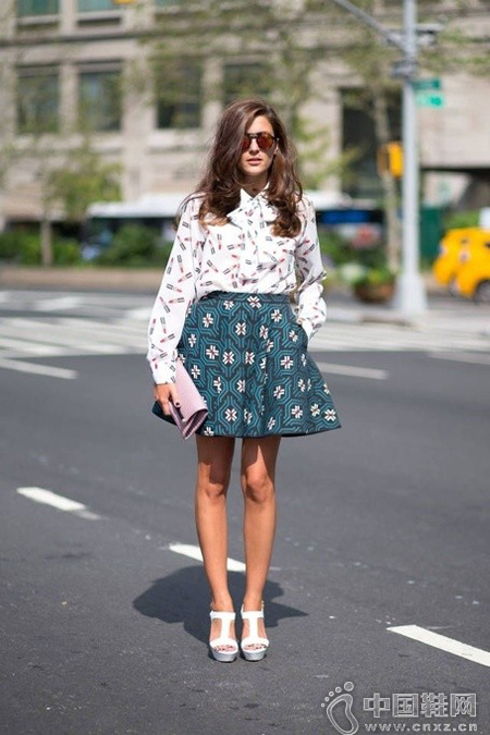 搭配印花裙的要诀在于简约纯色,避免全身让人眼花缭乱。而一双万能白色凉鞋似乎能解决衣橱里形形色色印花裙的搭配问题。