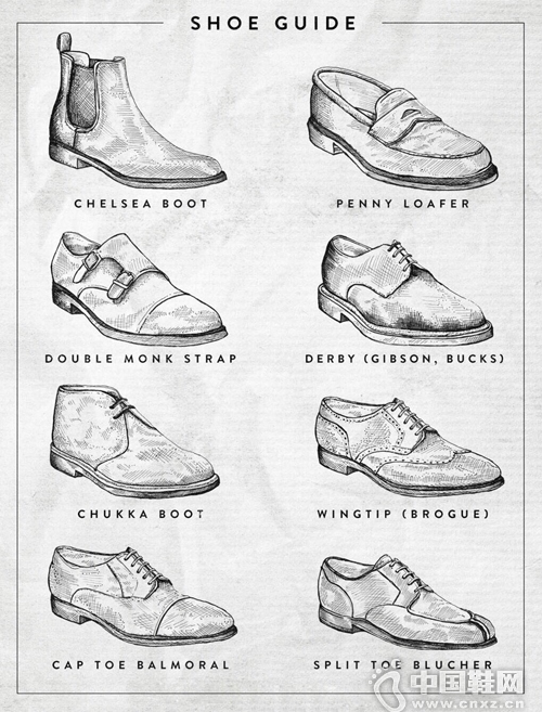 非常明晰地,这张图展示了最经典男鞋的数种款式,但全英文的鞋名和简要图片示意还是让许多时尚人们不得要领。
