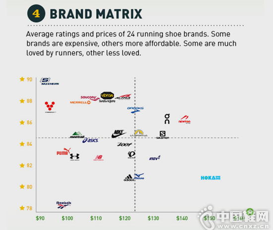 在 Brand Matrix 图表中,星星越多代表评价越高,左上角代表性价比最高,右下角最低,Skechers 的表现会否令你刮目相看?网站同时整合所有测试跑鞋排名,近年开始涉猎路跑的山野装备专家 Salomon S-Lab Sense Ultra SG 以 94 分位列榜首,仅次有 Saucony Stabil 与 Saucony Triumph ISO,排行榜同时设有 Filter,让读者根据路况、足弓支援、价钱等条件整理排名结果。由于网站收集的数据多英语地区,而亚洲人脚掌明显较西方人阔,所以结论未必全球通行,但其报告获《Wall Street Journal》、《The New York Times》、《The Guardian》与《Washington Post》认可引用,肯定其参考价值。