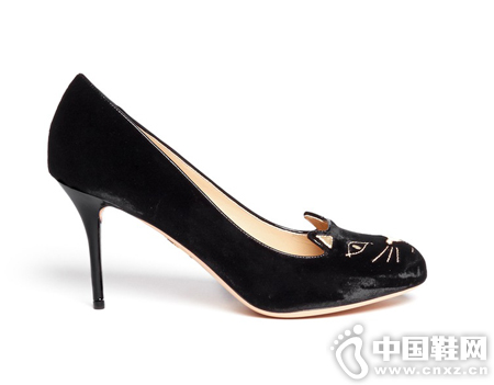 Charlotte Olympia 丝绒猫脸高跟鞋,以猫的五官及耳朵为主题,利用金色线精心缝制,趣味性及可爱度满分,加上黑色丝绒作面料,舒适柔软的程度令人联想起小猫身上的毛,可搭配充满青春活力的洋装,尽显甜美可人的少女情怀。