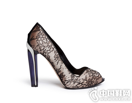 ALEXANDER MCQUEEN 蕾丝缎面拼贴透明鞋跟高跟鞋,黑色蕾丝覆盖在裸色缎面之上,鱼嘴及微V形鞋口线条流畅优美,独特的透明鞋跟是焦点所在,结合银色柱形细跟拼贴,效果前卫摩登,创意十足。