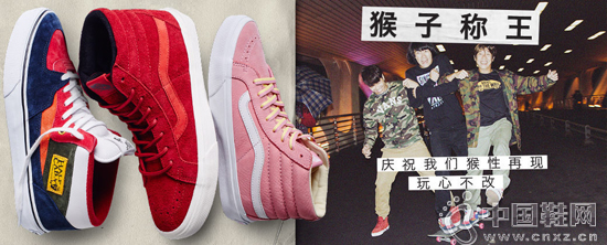 Vans专门为猴年打造了一次“猴子称王,顽无忌惮”的新年Campaign,三款新鞋的设计灵感源于1980、1992和2004年的猴年纪念邮票,鞋款分别为Sk8-Hi和Half Cab两个款式。虽然设计成品效果一般,但彩头不错。
