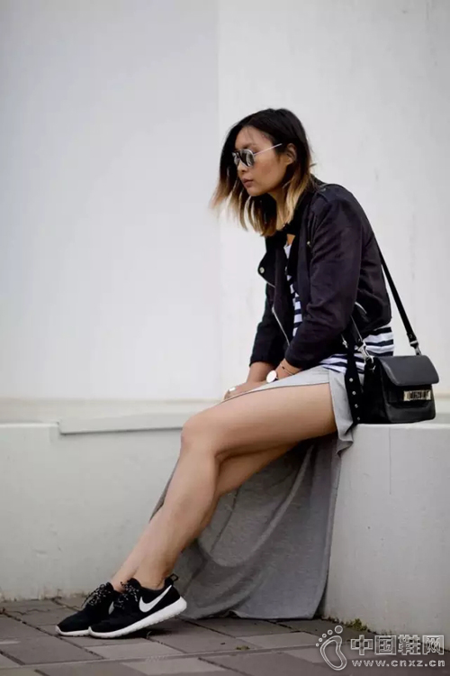 ▼ 短款的黑色夹克衫不是和白恤衫就是和条纹衫搭配,灰色大开叉裙和Roshe one搭完全没有过分性感的嫌疑,背个黑色小包,怎么看怎么帅~