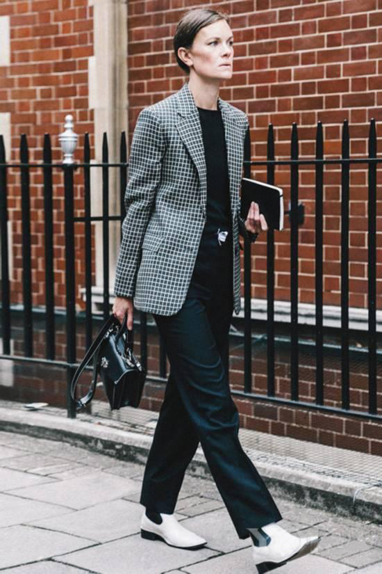 帅气的切尔西款小白靴最适合搭配中性风的长裤了,像下面这组用all black搭配一双小白靴,让鞋子更有点题的视觉效果。