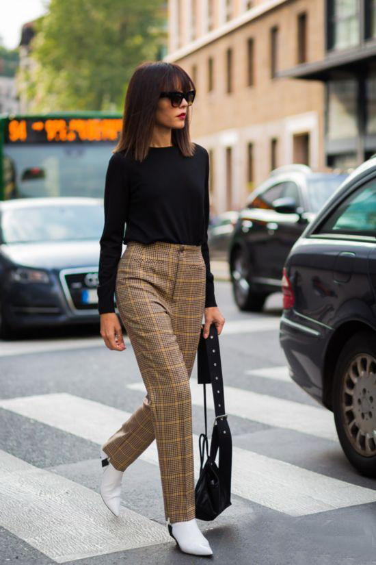 尖头款的矮跟小白靴则更有妩媚干练的感觉,搭配这个秋冬火翻天的小细格印花长裤和简单的黑色毛衫,别有一种时髦复古感.。