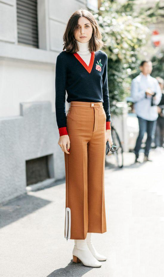 靴筒稍长一些的踝靴款最适合搭配一条七分裤或者八分裤,跟部的不同颜色或者材质也会让小白靴看上去有不同的变化。