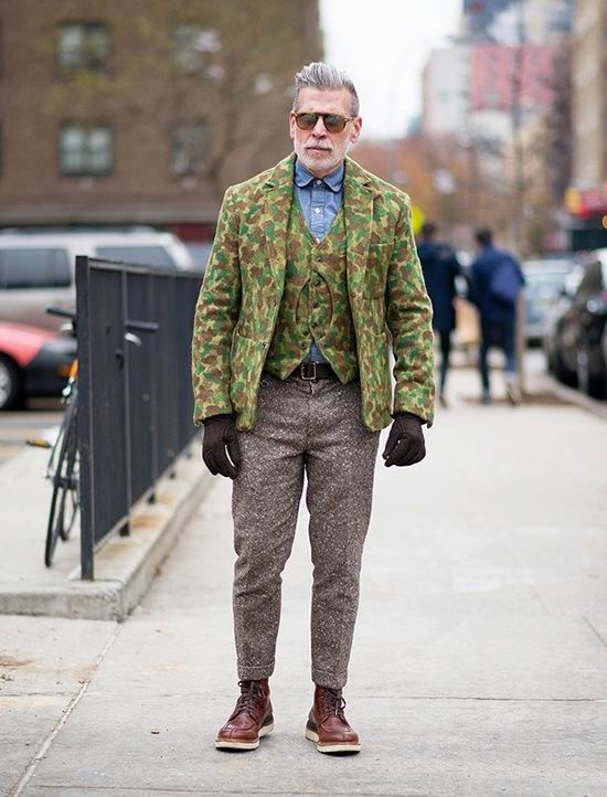 ▼传奇大叔Nick Wooster 也穿上工作靴大展 MAN 味,身上的迷彩外套巧妙地和靴子相呼应着,不过裤子材质和花色挑选如此高端混搭的技巧,大概只有他本人穿才能仍然气势十足吧!