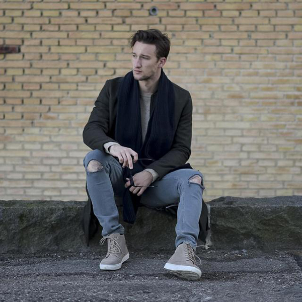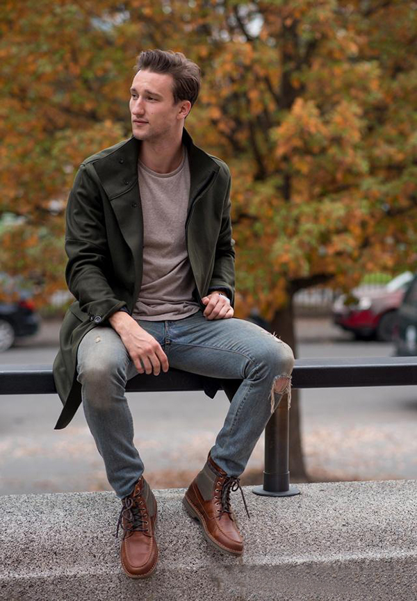 风衣+T恤+破洞牛仔裤+高帮鞋任何男生都会用T恤搭配牛仔裤,但如果选择了破洞款牛仔裤,再脚踏一双绑带靴,立刻就比别人帅气了几分,展现出个性,外搭一件风衣,优雅尽显!