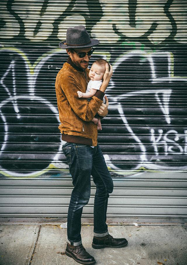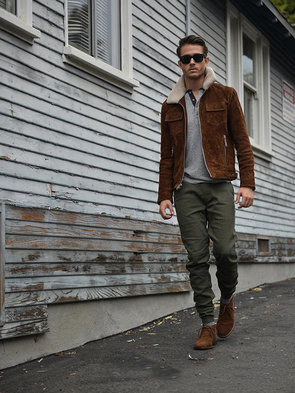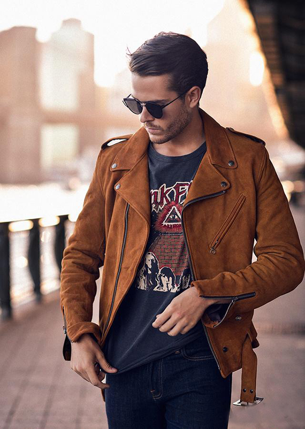 编辑建议:麂皮夹克风格复古,最好可以搭配一些经典的复古元素,比如圆顶毡皮帽,棕色、深咖色皮鞋(靴)……挽起裤脚这个小细节也很加分。