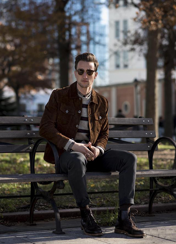 麂皮夹克+衬衫(T恤/毛衫)+牛仔裤+绑带鞋麂皮夹克的魅力势不可挡,风格个性复古,轻薄款不止能做外套,更被很多的潮人们用来做秋冬隔层,搭配出丰富的层次,而且穿脱自如,应对室内外的温差。