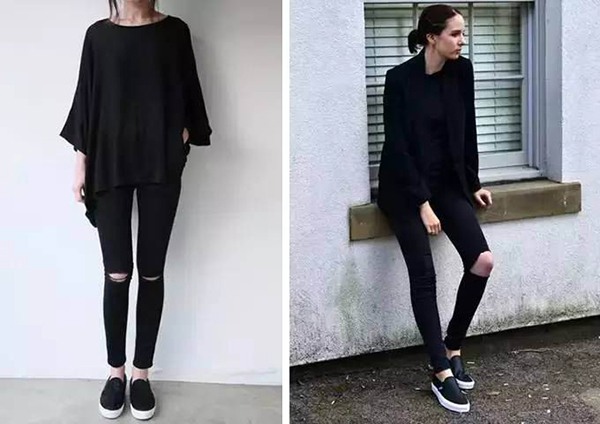 同样是全黑穿搭,不是配懒人鞋而是配短靴,就有很大的差异性!