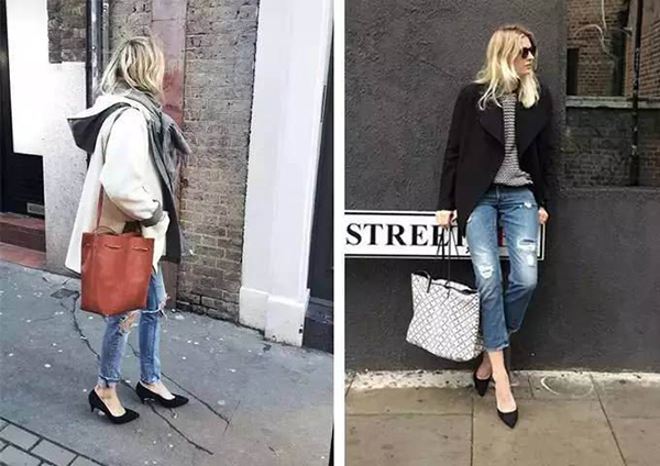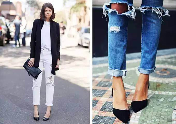 正式感的黑色高跟鞋搭配破裤别有韵味。