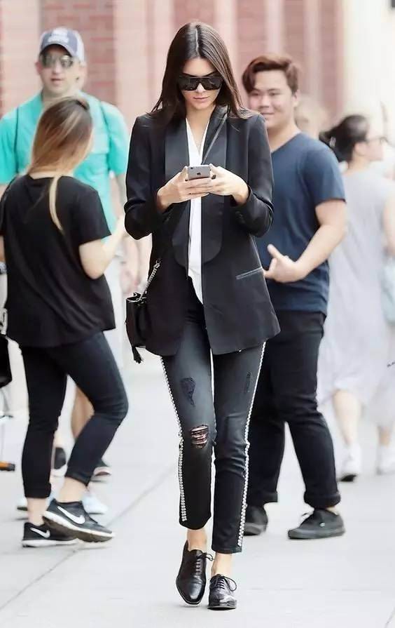 一身黑色气场十足,西装小外套和黑色牛仔裤,内搭简约的白色就能穿出超模气质。