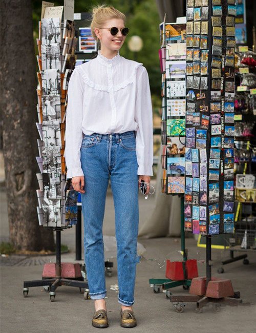 黄绿色浅口乐福鞋+宽松窄口牛仔裤+白色高领雪纺衫=清新少女风。复古版英伦黄绿色乐福鞋与蓝色牛仔裤搭配,白色雪纺衫束腰,仿佛是从丛林中走出来的青春少女。