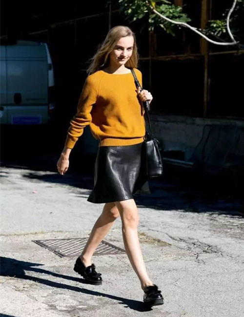 黑色毛绒乐福鞋+漆皮半身裙+黄色宽松针织衫=帅气少女风。小编认为暗黄色与黑色为绝配,一般服饰搭配全身主色不超过三种颜色,所以黑色半身裙搭配黑色鞋子,以及黑色单肩包,更能凸显上衣的黄色,而黄色又是最显肤色的颜色。