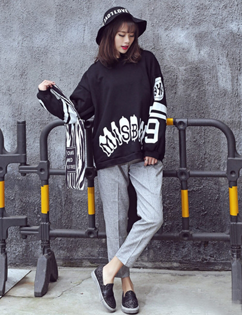 黑色休闲乐福鞋+九分窄脚西裤+黑色宽松长款Fithot卫衣=活力运动风。