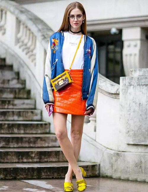 黄色赫本鞋+橙色半身格纹裙+蓝色拉风外套=缤纷绚丽风。这种大胆的搭配适合皮肤白嫩,身材姣好的美眉,很少有人能撑得起这种缤纷的搭配。