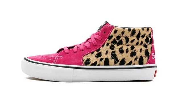 以粉色麂皮材质打造中帮鞋身,在鞋身后半段搭配抢眼的天鹅绒材质豹纹图案,并将双方 Logo 点缀于鞋舌及后跟,最后搭载白色硫化中底收尾。
