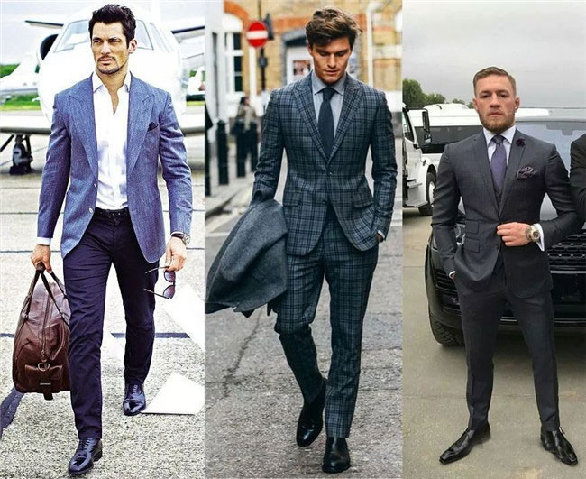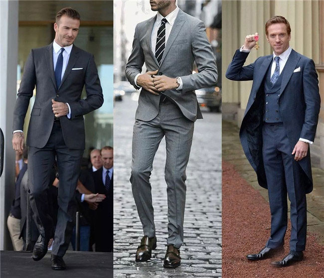 配套黑色鞋西装比较正式,显得庄重。看颜色,中间这套已经偏淡了,去到婚礼、法庭、教堂等严肃场合会比较扎眼。