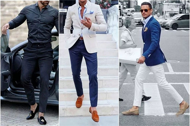 现在流行时尚都喜欢比较紧小的西装,显得性感,露出一截脚踝也是代表性感(没错,男人也有喜欢露肉的),但也要适度,比如像下右这张,又短又紧小,左边这个更是把西裤做成紧身弹力牛仔裤了,作为一个直男还是有点接受不了。