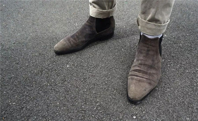 擦色鞋子搭配精纺面料的正装裤子反差会有点大。