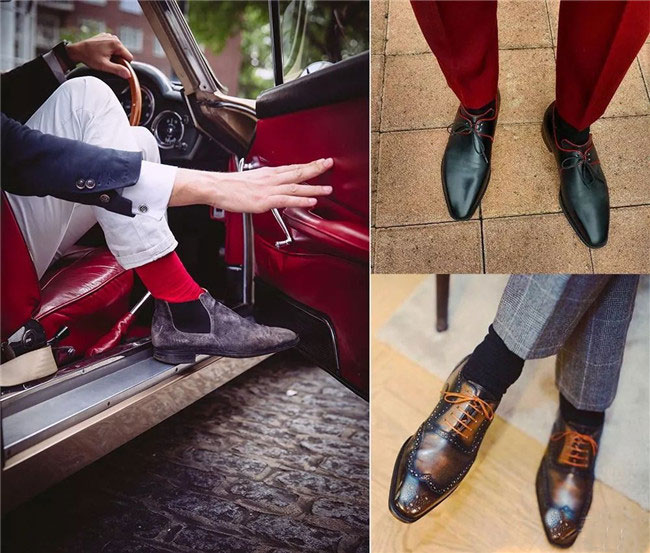 比如下图这条灰色裤子穿这双红鞋子就过于正式,明显没有右边那条鼹鼠皮橙色裤子配绿色皮鞋好看,可能配深色牛仔裤或卡其裤更合适。
