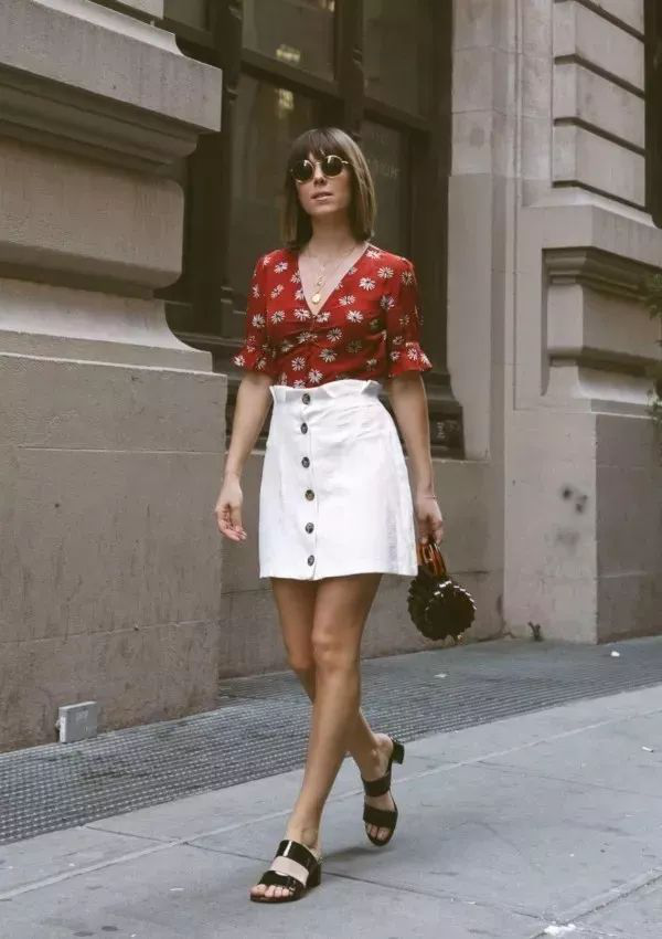 短裙在夏天成为哈比人们的变美利器,可以延伸腿部视觉比例,打造理想身材。但短裙的修饰功能是有限的,如果想要自己的腿部轮廓更加好看的话,你需要一双小方跟来提升。V领碎花上衣,搭配白色纽扣半裙,脚上踩一双小方跟,有点度假风的feel,满满的夏日感。