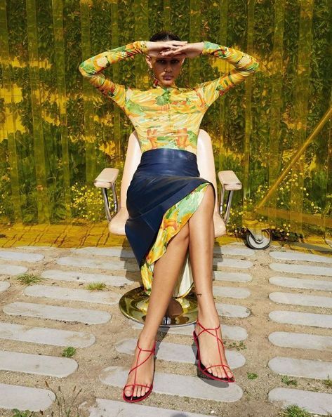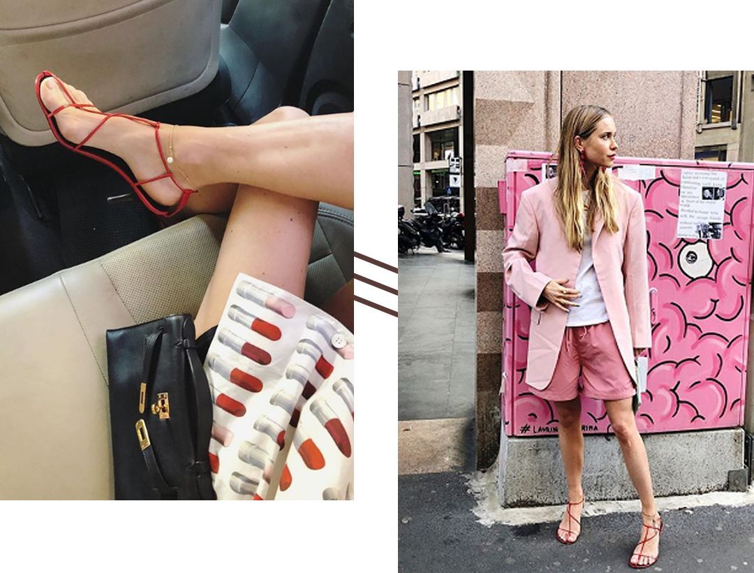 同品牌还有一款红色多条交错细带凉鞋也是博主们的心头爱,比如 Aimee Song 就十分钟情于它。