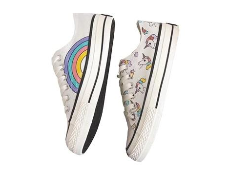 今年春季,匡威的一款颜值超高的彩虹独角兽帆布鞋燃爆了少女心,彩色粉萌的独角兽图案本就足够圈粉,设计师还迷不死人不罢休地将鞋子设计成了一面彩虹一面独角兽图案的鸳鸯款,牢牢吸引住了时髦精的目光。而代购300-500元不等的价格,在匡威的系列鞋款里算是普通平价,更激发了姑娘们前赴后继买它的决心。除了独角兽款,记者在官网上看到,匡威还有一款KITTY猫款在售。