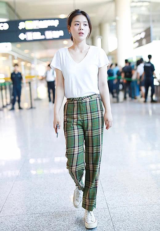 帆布鞋,虽然看着不起眼,但是它却很好搭配,对时尚小白来说,帆布鞋可以说是一年365天都可以穿的必备品,马思纯用V领白T恤搭配格纹裤,再脚踩一双白色帆布鞋与T恤的颜色呼应,简约清爽,十分的小清新哦!