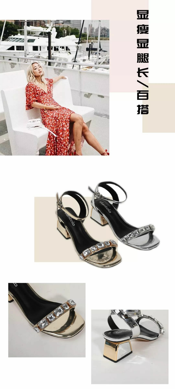面对夏日里焦躁又烦闷的情绪,你需要一件bling bling的物件来点亮你的心情。bling bling的金色和银色一字带凉鞋,舒适的粗跟设计,闪耀着光芒的钻饰,在人群中十分抢眼,更具未来感。让你每天在出门前,都想选择它。