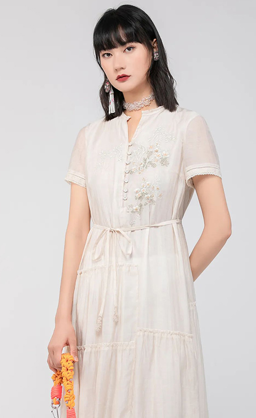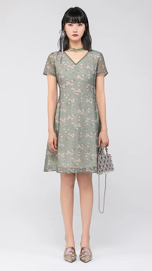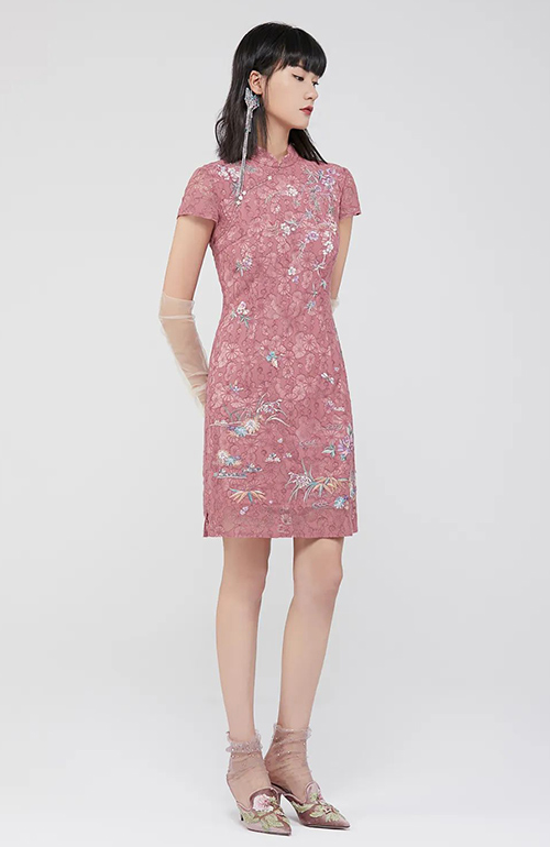 镂空提花+粉彩花鸟刺绣,从细节提升整体精致度。版型保留传统旗袍的经典韵味,融合蕾丝元素,打造新中式美学。