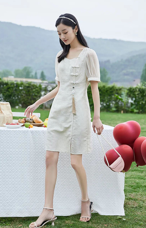 奶油般的旗袍裙柔软细腻,文艺立领独立中带有些许柔和,也无时不在抚慰人心,温柔的为你带来陪伴与安慰,让你不畏困难不惧慌乱。她是带我们来这个世上的领路人,童年悄悄穿上她的裙子、高跟鞋,这或许是我们对于美的启蒙,童年时光里藏着的是母亲人生的馈赠,你给的回礼是这一串挂坠里藏着的诗意东方,与自强生长的蓬勃力量。
