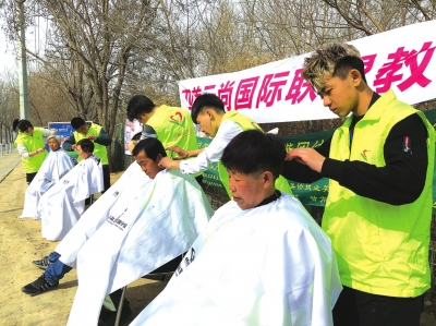 上午11时,来自甘肃美旗职业培训学校的5位志愿者赶到现场,他们携带专业理发工具,为十多位环卫工提供了免费理发服务。